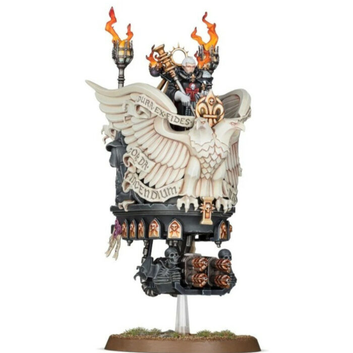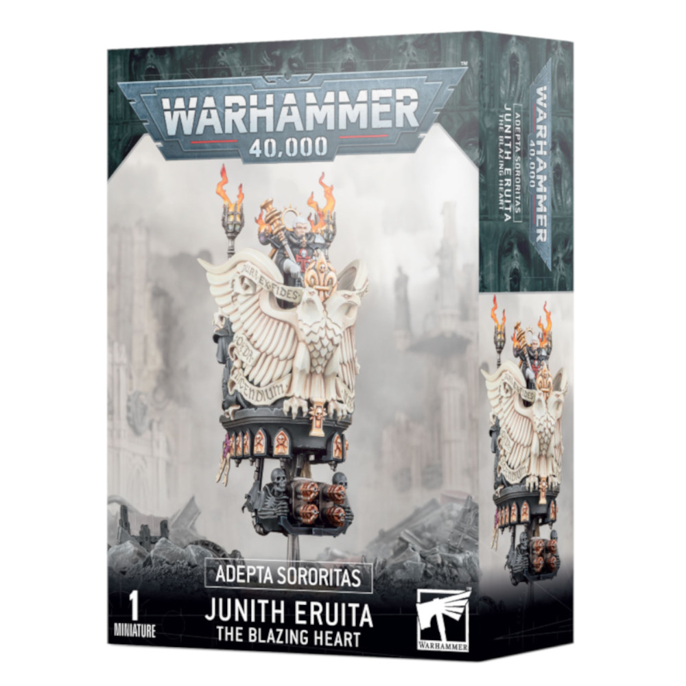 Junith Eruita choix QG unique pour l'Adepta Sororitas. Armée de la légendaire Masse de Castigation, elle est flanquée de braseros ardents et sa chaire est équipée d'une paire de lance-flammes lourds – les hérétiques ne vont pas s'incinérer tout seuls!
