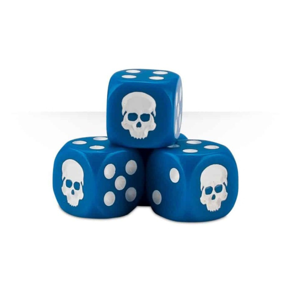 Un robuste cube en plastique contenant 20 dés bleus de 12mm avec une icône de crâne à la place du 1. Ce cube de dés a un couvercle orné d'un crâne (on n'en a jamais assez) et on peut l'empiler sur d'autres cubes de dés, pour créer votre propre menhir de dés multicolore !