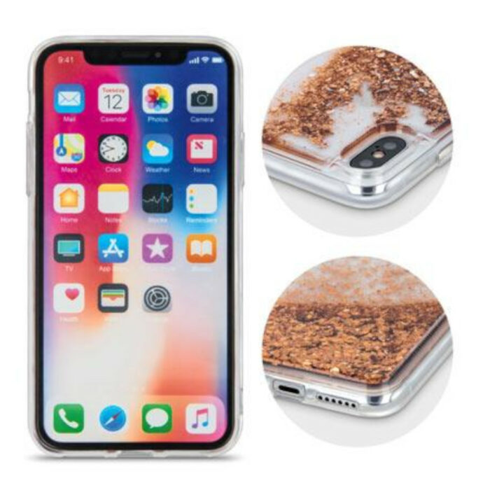 Étui en silicone de haute qualité. Le dos présente de petites décorations, des paillettes immergées dans l'eau, qui débordent légèrement lorsqu'on les déplace. Il protège l'arrière et les côtés du téléphone et comporte des découpes pour les prises. Un écrin moderne et époustouflant.