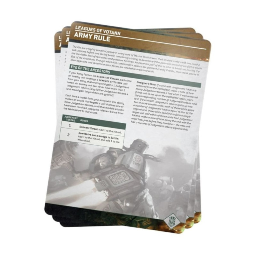 – 3x Cartes d'Index des Ligues de Votann, détaillant les règles d'armée de la faction et le Détachement Bande Assermentée