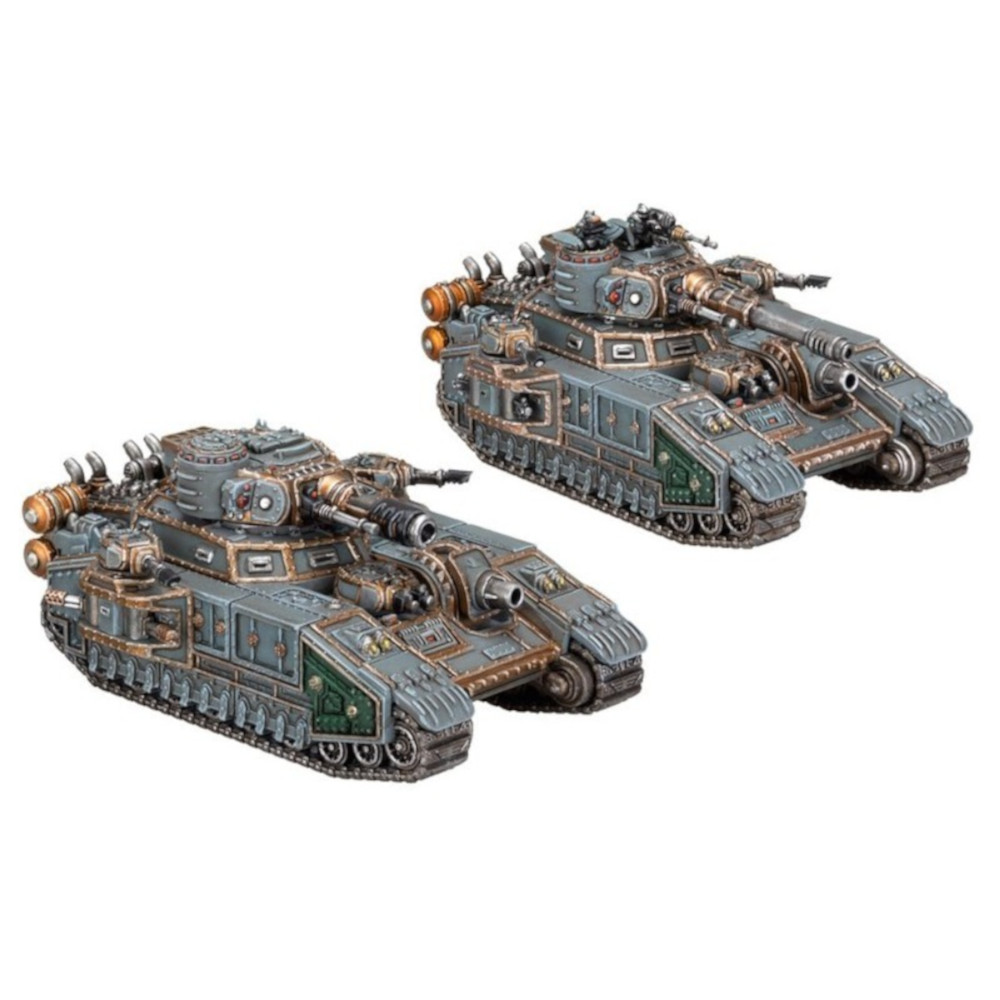 En plus de ces options d'armes, les deux chars sont dotés d'un canon Demolisher monté sur la coque et d'un bolter lourd jumelé, ainsi que de canons laser latéraux. Le kit inclut des options esthétiques pour la coupole du char, ce qui vous permet de personnaliser vos véhicules avec des artilleurs, des observateurs, des écoutilles fermées, etc.