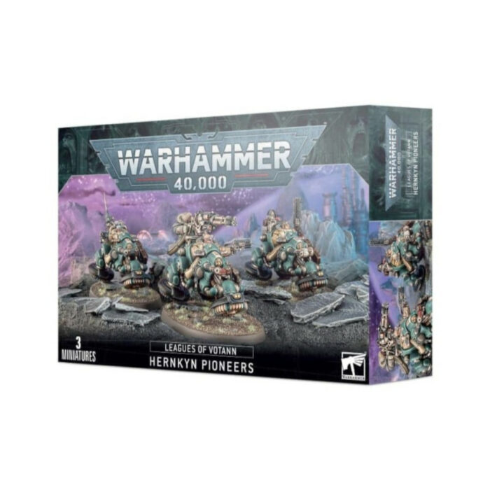 Ce kit palstique permet d'assembler trois Pionniers Hernkogs, des Cognats conduisant des motos antigrav manœuvrables. Chaque véhicule comprend un autocanon à magna-rail monté sur la coque, tandis que les pilotes sont armés de revolvers bolters et de fusils à pompe bolters, soit tenus en main soit accrochés à la moto, ainsi que de grenades à percussion gravitiques. Le kit contient un large choix d'équipement spécialisé : une moto peut être accompagnée d'un artilleur arrière utilisant soit un canon rotatif HYLaser soit un faisceau à ions, tandis que d'autres motos peuvent être équipées d'un Projecteur sur rail, d'une panoplie de transmission multibande ou d'un scanner panspectral. Vous trouverez également un large choix d'arimages et d'éléments esthétiques pour personnaliser chacune de vos motos, ainsi que 10 têtes différentes portant des lunettes, des capuches ou des bonnets de vol, dont une tête de Cognat de Fer.