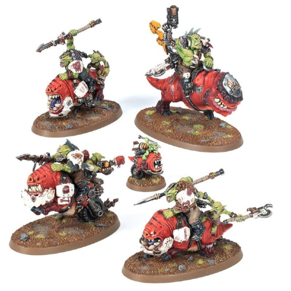 Comme si leurs impressionnantes charges ne suffisaient pas, les Boyz sur Squigliers lancent aussi des kipiks explosifs propulsés par des rokettes sur l'ennemi, attendrissant les blindages un peu trop durs au passage. Derrière chaque boy s'accroche un malheureux grot de selle, qui bombarde l'ennemi avec tout ce qu'il peut attraper – tout en priant Gork de ne pas tomber pour finir piétiné. Les meutes de Boyz sur Squigliers sont souvent accompagnés de squigs bombes – des armes vivantes qui présentent un manque alarmant de sens de l'auto-préservation en se précipitant au milieu du gros des combats avant de détoner. Si vous devez briser une ligne ennemie fortifiée ou faire sauter une phalange de véhicules, ce maelström de carnage à propulsion squig est fait pour vous.