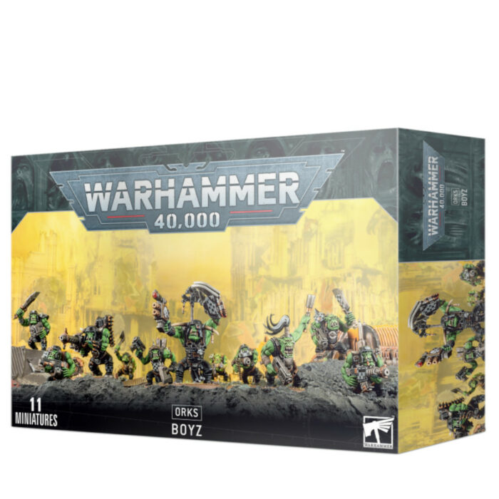 Cette boîte contient 11 Ork Boyz en plastique, avec de quoi les équiper de kalibr', kikoup', fling', armes lourdes et autres frags à manche.