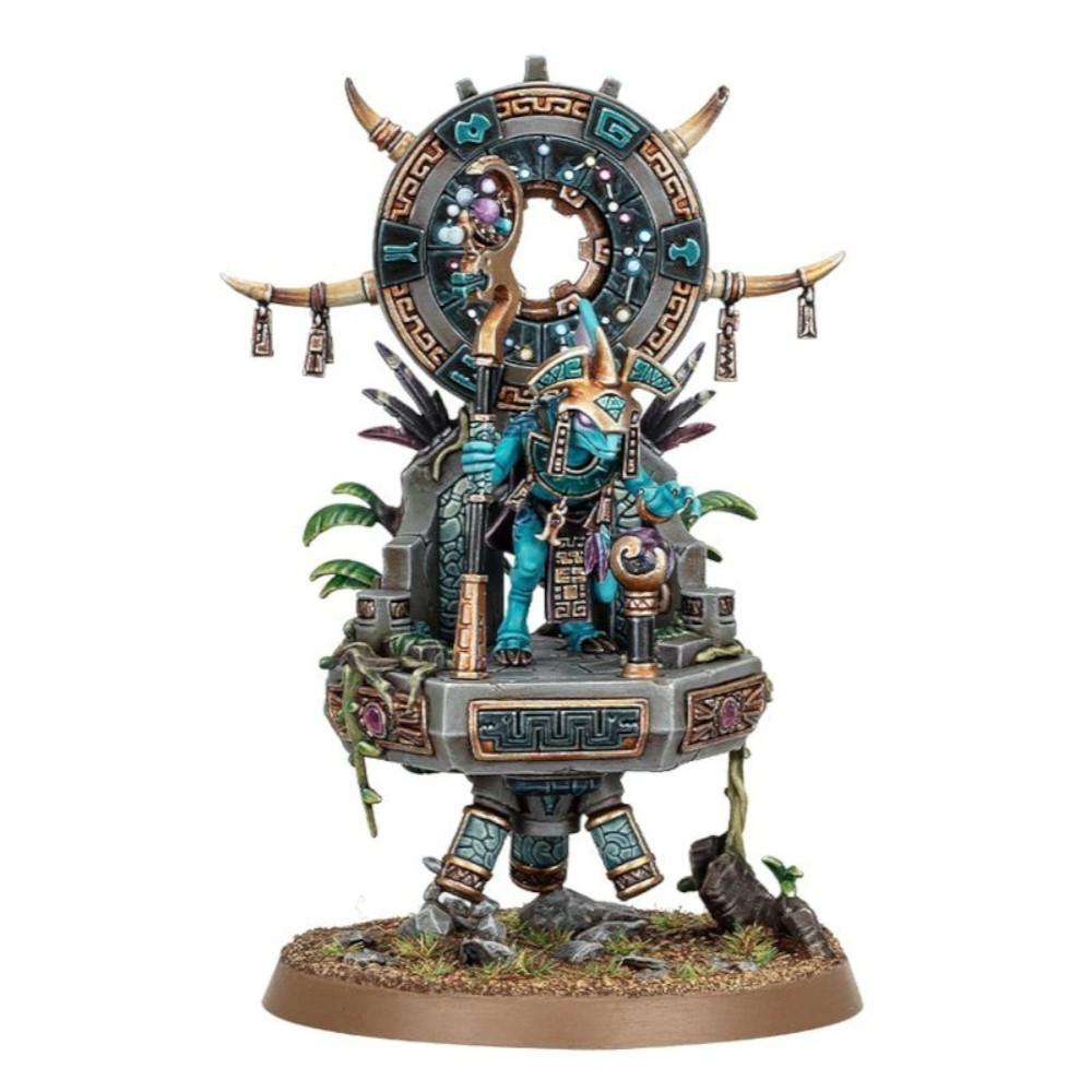 Ce kit plastique permet d'assembler un Astromancien Skink, un astrologue ésotérique sis sur un palanquin flottant.