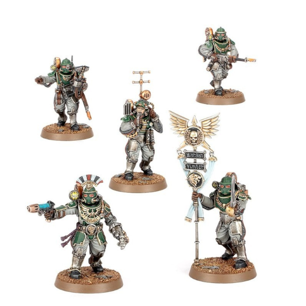 Ces soldats sont engoncés dans des scaphandres aux décorations sophistiquées et portent de l'équipement de commandement en plus de leurs fusils laser; le kit contient un scanner augure, un vox d'état-major et un fier vexillum des Cohortes, ainsi qu'une redoutable bombe à fusion.