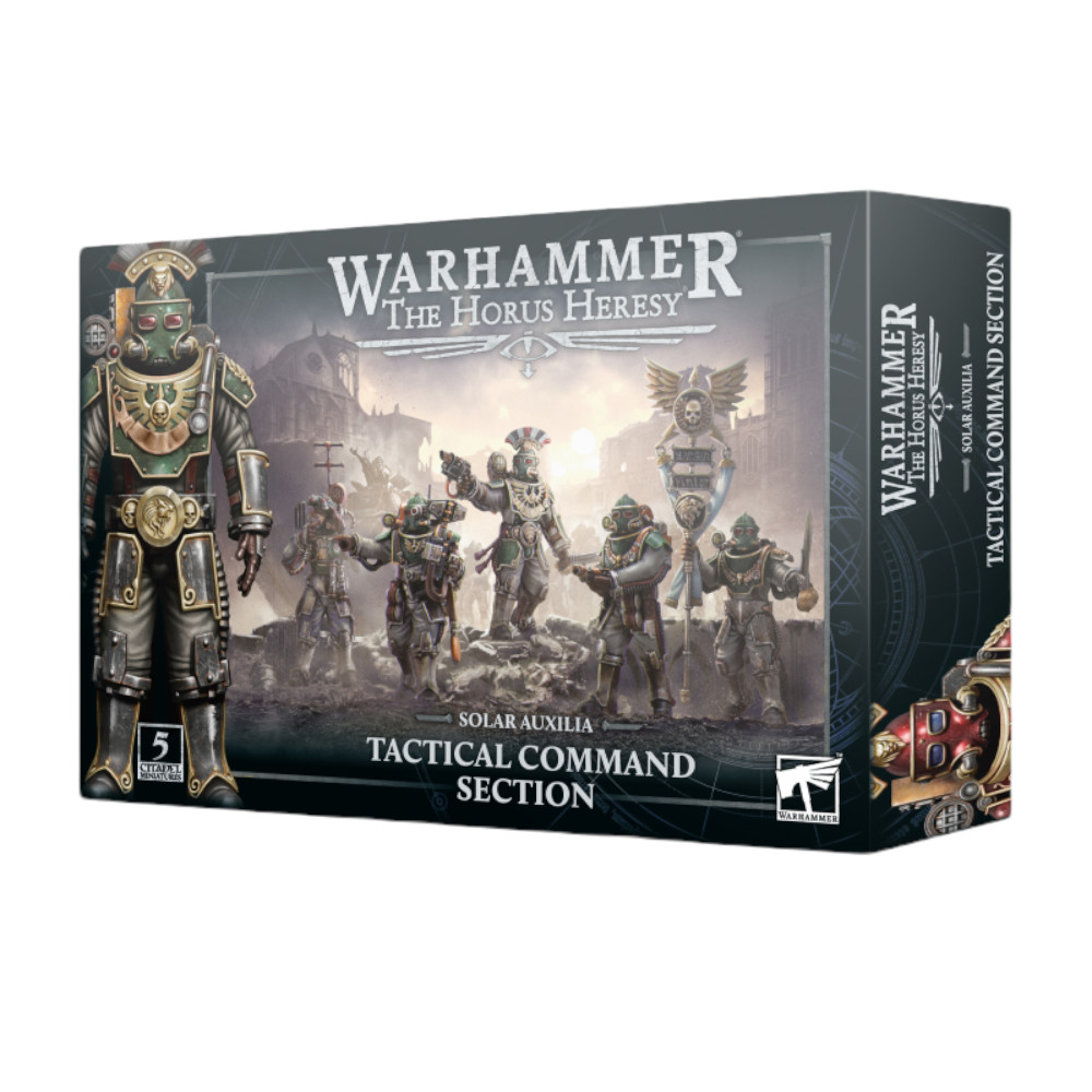 Ce kit plastique permet d'assembler une Section d'État-major Tactique des Solar Auxilia composée d'un Capitaine Auxilia et de quatre Compagnons Auxilia.