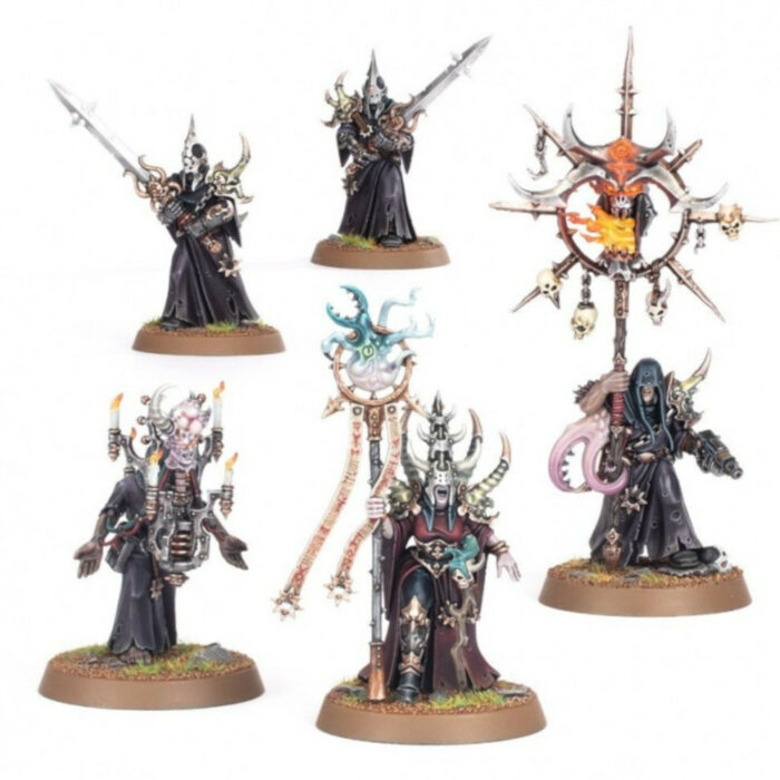 Les membres de cette cabale démente arborent de sombres robes, des talismans et des masques démoniaques rappelant ceux de leurs disciples Cultistes du Chaos.