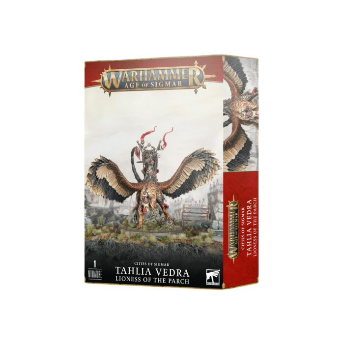 Ce kit plastique permet d'assembler Tahlia Vedra, la Lionne de l'Aride, juchée sur Infernacre, sa manticore rugissante à corps de lion ailé et queue de scorpide.